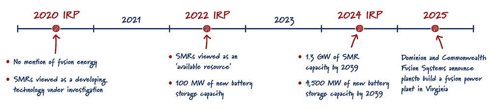 Fusion energy was not even mentioned 5 years ago in Dominion’s 2020 IRP or subsequent updates until 2023. SMRs were not viewed as an “available resource” for deployment until the 2022 IRP. Prior to that, in the 2020 IRP, SMRs were only discussed as a developing technology under investigation. Now, plans call for significant new SMR capacity, such as the 1.3 GW proposed by 2039 in the 2024 IRP. Battery storage also shows a striking increase in Dominion’s plans. While the 2022 IRP called for approximately 100 MW of new battery storage capacity, the 2024 IRP now projects as much as 4,500 MW of battery storage by 2039.