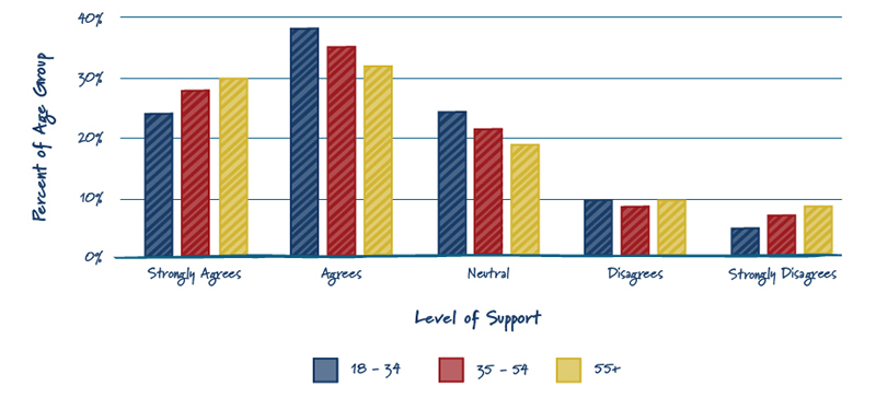 Gen Z and Millennials have grown up with a constant barrage of climate news. Combine that with the climate impacts in the U.S. and around the world, you can understand why younger generations are less likely to oppose nuclear energy. They view both climate action and energy independence as extremely important, and are more flexible on taking an all-of-the-above approach to clean energy solutions. As noted in the chart below, ages 18-54 hold less strong opinions on nuclear energy than ages 55 and above.