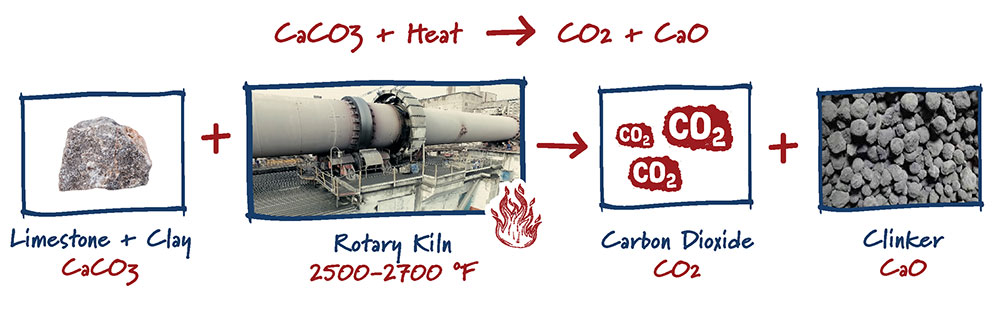 The carbon dioxide emitted in this reaction is referred to as “process emissions,” since they would be created – even if the heat was produced without burning fossil fuels. About 60% of a cement plant’s emissions are process emissions. They are the main reason cement production cannot be decarbonized without carbon capture technologies